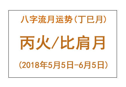 • 2018年八字丁巳月运势:丙火/比肩月 2018年八字丁巳月运势:丙火/劫财/比肩月(流年食神) 八字流月运势:丁巳月丙火(2018年5月5日 – 6月5日) 火行人 – 人脉月 5/14、5/15、5/24、5/25 缴税就交给比劫日吧! 上半月(5/5 – 5/20),丁火作为主气,对于丙火而言,此... 2018-05-05