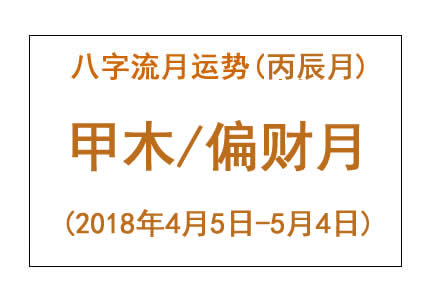 2018年八字丙辰月运势:甲木/食神/偏财月(流年偏财) 八字流月运势:丙辰月甲木(2018年4月5日 – 5月4日) 倘若前两个月过得颇为不顺心,一直对这流年状况心生怀疑的甲木朋友,在这里要告知大家,你们即将转运啦,即将体验到偏财流年所带来的强大助力与畅快之感。 要是前两个月过得还算不...