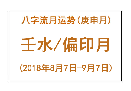 • 2018年八字庚申月运势:壬水/偏印月 八字流月运势:庚申月壬水(2018年8月7日 – 9月7日) 【壬水】偏印月(流年七煞) 内在感受:在庚申月,壬水极易受到外界刺激。这感觉就好像置身于郭富城的“醉鸡帝国”一般,哈哈,说是“最激帝国”更为贴切!仿佛有许多人排着队要来刺激壬水。平日里,壬水还算冷静,毕竟它象征着大海。然而,在... 2018-08-06