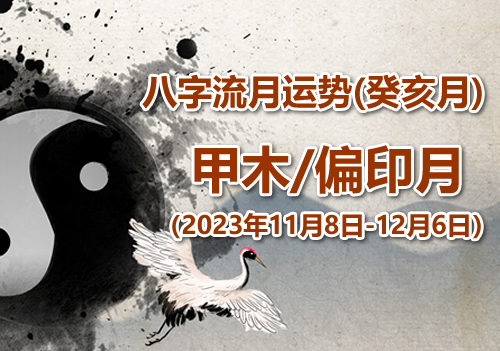 • 2023年八字癸亥月运势:甲木/偏印月 2023年八字癸亥月运势(2023年11月8日 – 12月6日):甲木/偏印月 在2023年的癸亥流月中,甲木于天干的运势呈现为“正印”,在地支的运势则是“偏印”。流月天干癸会暗中合掉戊土,这相当于将甲木的“偏财”给合去了。 工作:本月工作上会出现诸多贵人与助力,然而也有不少人从中扯后腿... 2023-11-06